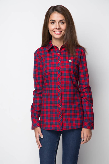 Практичная блуза вкрасно-синюю клетку. Изготовлена из стопроцентного хлопка, имеет классичский покрой, манжеты и рубашечный воротник.